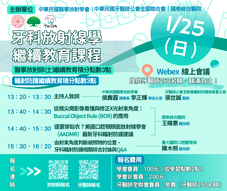 全聯會輻防委員會訂於115年1月25日與中華民國醫事放射學會、國泰綜合醫院共同舉辦「牙科放射線學繼續教育視訊課程」。